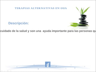 El proyecto Guadalinfo se centra en la implementación de terapias alternativas para mejorar la salud y bienestar de las personas a través de talleres, formaciones y experiencias grupales. Se emplean diversas técnicas como reiki, acupuntura y musicoterapia, promoviendo la formación de dinamizadores y la difusión de información mediante redes sociales y jornadas de sensibilización. El objetivo principal es facilitar el conocimiento y uso de estas terapias, apoyándose en un espacio web para coordinar acciones entre administraciones y ciudadanos.