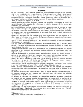 Tagxedo es una herramienta web gratuita para crear presentaciones visuales en forma de nubes de palabras a partir de textos introducidos por el usuario. Ofrece diversas opciones de personalización como cambiar la forma, color y tipo de letra de la nube. El documento propone numerosas ideas didácticas para usar Tagxedo en el aula como crear mapas, resúmenes o practicar vocabulario en diferentes asignaturas.