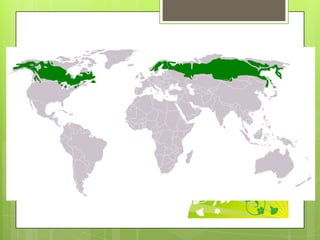 La taiga es un bioma boscoso de coníferas que se encuentra en las zonas del norte de Rusia, Siberia, Europa y América del Norte. Se caracteriza por sus densos bosques de coníferas y un clima frío, con temperaturas de hasta 19°C en verano y -30°C en invierno. La fauna y flora de la taiga se han adaptado a sobrevivir en estas duras condiciones, aunque actualmente enfrentan amenazas debido a la explotación maderera, minería, desarrollo hidroeléct