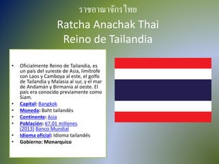 Tailandia es un país del sureste asiático con clima tropical húmedo. La gastronomía tailandesa se caracteriza por sus sabores picantes, amargos, dulces y cítricos. La religión predominante es el budismo Theravada, practicado por el 95% de la población. El budismo enseña sobre el proceso de cambio constante de la vida y las prácticas como la meditación para desarrollar estados mentales positivos.