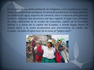 El documento describe diferentes celebraciones de carnaval en Ecuador, incluyendo en las ciudades de Guaranda, Ambato y Guamote. El carnaval ecuatoriano se caracteriza por el uso de agua, espuma, talco o pintura vegetal en la cara, y se celebra con música, baile y licor tradicional. La fiesta en Guaranda dura ocho días y destaca por sus desfiles, máscaras, poesía y danzas.