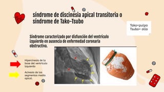 El síndrome de tako-tsubo, conocido como el síndrome del corazón roto, se caracteriza por disfunción del ventrículo izquierdo sin enfermedad coronaria obstructiva y afecta principalmente a mujeres posmenopáusicas. Suele desencadenarse por situaciones estresantes y presenta síntomas como dolor torácico súbito y elevación de biomarcadores cardíacos, aunque no hay lesiones coronarias en la coronariografía. El tratamiento incluye el manejo de la isquemia coronaria y la supresión de factores desencadenantes.