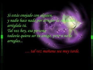 El documento enfatiza la importancia de expresar sentimientos como amor, aprecio y necesidad de apoyo hacia otras personas mientras aún se tiene la oportunidad, ya que las circunstancias pueden cambiar y hacer que mañana sea demasiado tarde para hacerlo. Aconseja arreglar disputas, confesar amor no dicho, dar afecto físico, expresar aprecio por amigos y familiares, y demostrar aprecio hacia los padres antes de que se marchen o la oportunidad pase.
