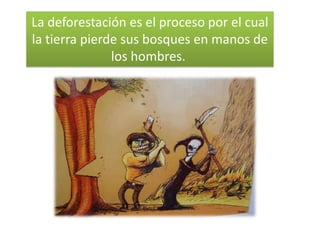 El documento habla sobre la tala inmoderada de árboles y sus consecuencias negativas como la erosión del suelo, alteraciones climáticas y reducción de la biodiversidad. La deforestación ocurre principalmente para extraer madera, ganar tierras para agricultura y ganadería, incendios y expansión urbana. El estado de Michoacán en México tiene altos niveles de tala ilegal, deforestación e incendios forestales. El cultivo de aguacate también está contribuyendo a la pérdida de bosques.