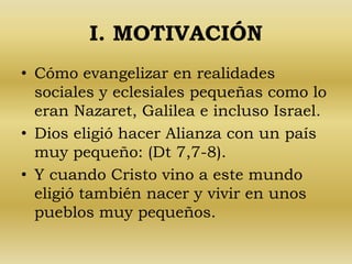 El documento reflexiona sobre la evangelización en comunidades pequeñas, destacando que Dios elige lo insignificante y nos invita a llevar el Evangelio con alegría y renovación. Se enfatiza la importancia de la experiencia cristiana personal y el encuentro con Dios a través de la mediación, además de la necesidad de una conversión y renovación continúas dentro de la Iglesia. Finalmente, se presenta el perfil del evangelizador como un testigo alegre y solidario, comprometido con los pobres y confiando en la acción del Espíritu Santo para llevar a cabo la misión de anunciar el Reino de Dios.