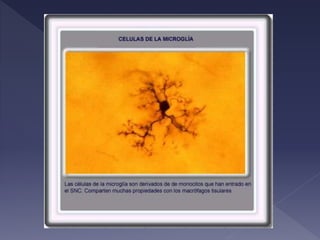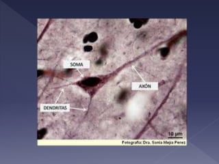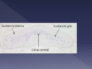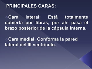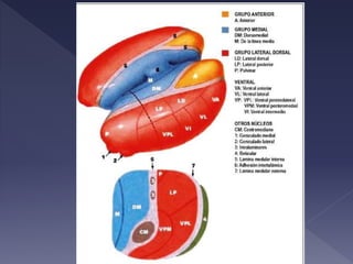 El documento describe la anatomía y función del tálamo. El tálamo es una estructura del diencéfalo que se divide en regiones y núcleos. Transmite información sensorial y motora entre el tronco encefálico y el cerebro, y participa en procesos como la percepción, la conciencia y la memoria. Contiene diversos tipos de células nerviosas y de soporte.