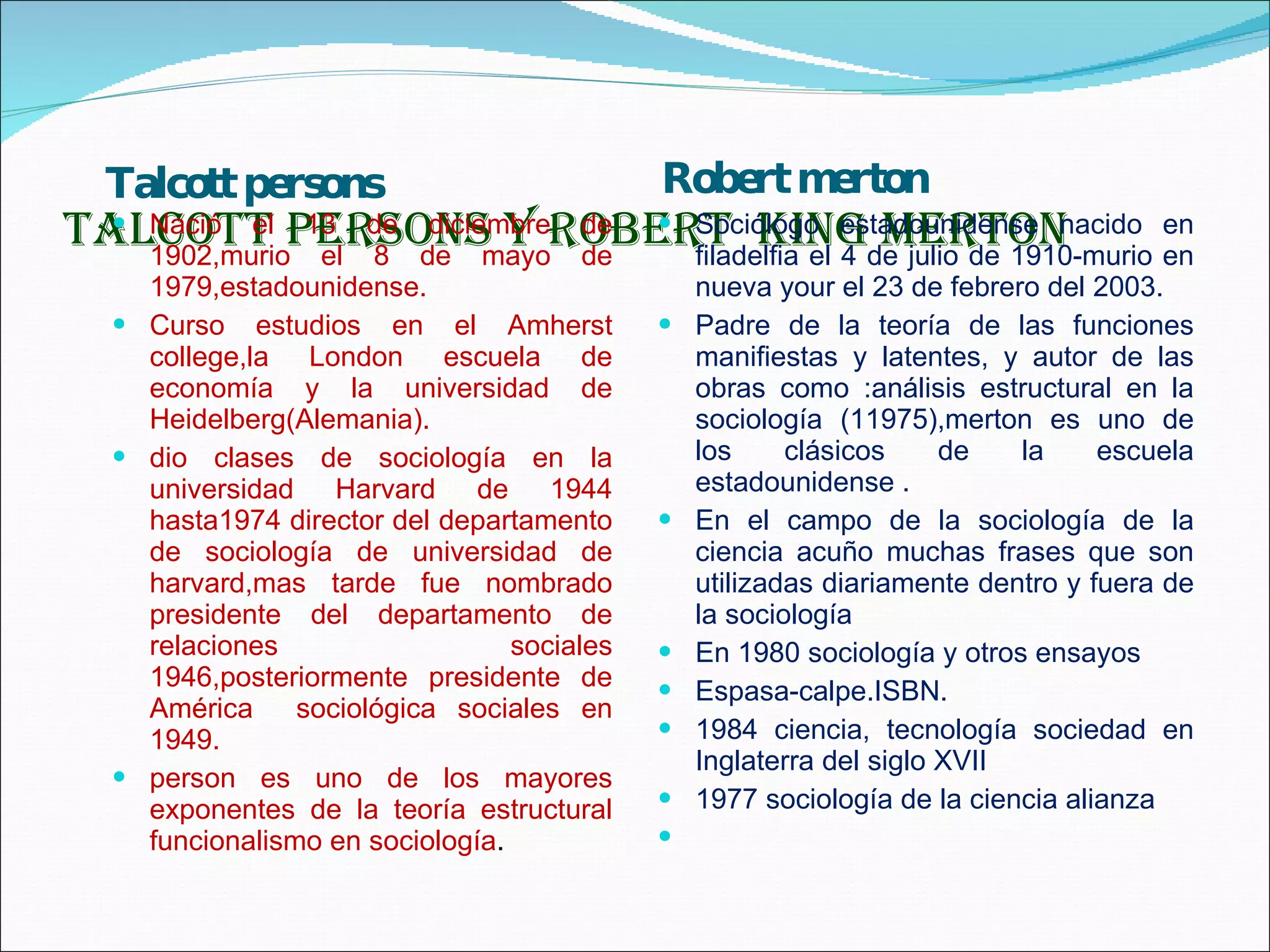 Talcott Parsons y Robert Merton fueron dos importantes sociólogos estadounidenses del siglo XX. Parsons desarrolló la teoría estructural funcionalista, la cual ve a la sociedad como un sistema compuesto por subsistemas interdependientes que cumplen funciones manifiestas y latentes para mantener el equilibrio social. Merton amplió esta teoría al distinguir entre funciones pretendidas y no pretendidas de los elementos sociales. Ambos teóricos influyeron en el estudio sociológico de la estructura y el funcionamiento de la sociedad.