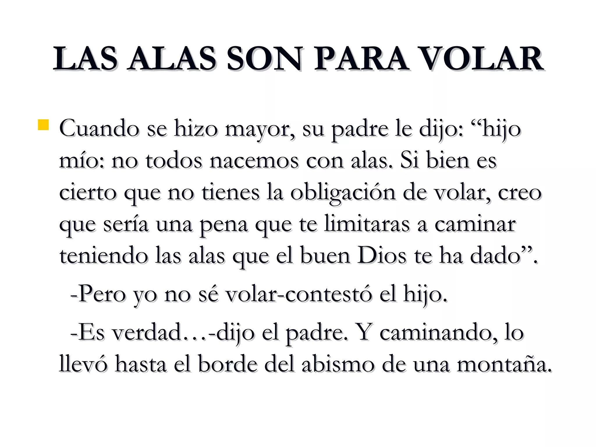 El documento habla sobre la importancia de enseñar a los hijos a volar con sus propias alas mediante la asunción de riesgos calculados y el desarrollo de la autonomía y la responsabilidad personal, en lugar de sobreprotegerlos. El padre anima a su hijo a saltar de una montaña para desplegar sus alas y volar, aunque tenga miedo a caerse. Aunque el hijo fracasa en su primer intento, el padre le explica que se necesita altura para volar y que asumir riesgos es parte