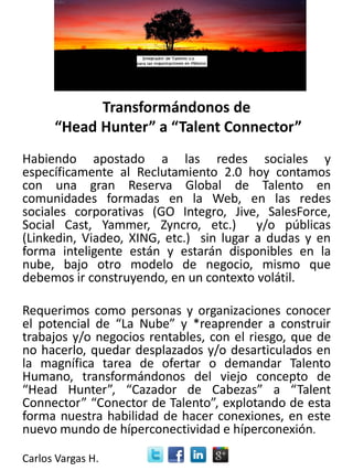 El documento aborda la transformación del reclutamiento de 'head hunter' a 'talent connector' aprovechando las redes sociales y el reclutamiento 2.0. Destaca la importancia de construir negocios en la nube para mantener la relevancia en un contexto volátil, subrayando la necesidad de reaprender a ofrecer y demandar talento. Carlos Vargas H. enfatiza que adaptarse a este nuevo modelo es esencial para no quedar desarticulados en la búsqueda de talento humano.