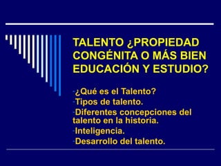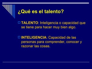 El documento discute diferentes concepciones del talento a lo largo de la historia, desde Platón hasta los filósofos modernos. Explica que el talento se refiere a la inteligencia o capacidad para hacer algo de manera excelente, y que la inteligencia es la capacidad de comprender y razonar. Según Gardner, existen varios tipos de inteligencia como la lingüística, matemática y emocional. El desarrollo del talento requiere no solo la inteligencia académica sino también hábitos mentales y el apoyo del entorno