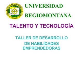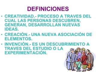 Este documento presenta definiciones de conceptos clave relacionados con la creatividad, la innovación y el desarrollo de habilidades emprendedoras como la creatividad, la invención, la innovación y el talento. También incluye generadores de ideas para estimular el pensamiento creativo como preguntas sobre cómo, dónde, quién, cuándo, por qué, agrandar, empequeñecer, reordenar, combinar, modificar y adaptar una idea. Finalmente, destaca que la solución efectiva de problemas depende del pensamiento