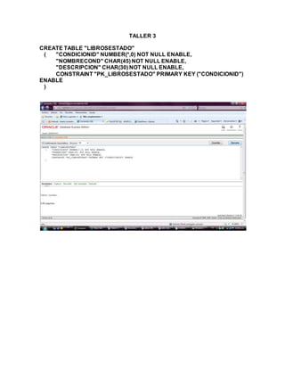 El documento describe la creación de tablas y la inserción de datos en una base de datos de una librería. Se crean tablas para libros, autores, clientes, empleados, órdenes y más. Luego se insertan datos de ejemplo en cada tabla como libros, autores, clientes, empleados y órdenes.