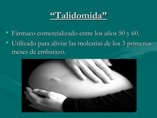 La talidomida fue un fármaco comercializado en los años 50 y 60 para aliviar las molestias del embarazo, creado por un médico nazi. Se vendió en más de 50 países y afectó a más de 20,000 personas. Tardíamente se descubrió que tenía efectos teratogénicos y causaba defectos de nacimiento. Esto llevó a establecer estrictos parámetros de prueba y aprobación para nuevos fármacos antes de su comercialización.
