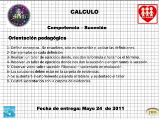 El documento detalla un curso sobre cálculo de competencias en sucesiones docentes, presentando definiciones, ejemplos y tipos de sucesiones como crecientes, decrecientes, convergentes y divergentes. Incluye filas de ejercicios y talleres donde los estudiantes deben aplicar los conocimientos adquiridos, además de realizar sustentaciones y presentar evidencias. Se establecen fechas de entrega y modalidades de evaluación para los participantes.