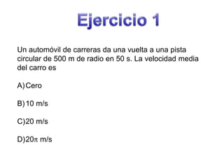 El documento contiene varios problemas de física relacionados con conceptos como velocidad media, aceleración, desplazamiento y rapidez. Aborda temas como el movimiento rectilíneo uniforme, movimiento rectilíneo uniformemente acelerado y gráficos que representan la posición, velocidad y aceleración de objetos en función del tiempo.