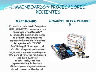 1. Se describen diferentes tipos de componentes de hardware de computadoras como motherboards, procesadores, memorias y discos duros recientes. Se detallan las características y especificaciones técnicas de estos componentes de varias marcas como Gigabyte, Asus, AMD, Intel, Samsung y otros.