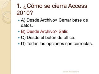 Este documento presenta 10 preguntas sobre cómo cerrar Access 2010 y sobre las diferentes barras y opciones disponibles en el programa. Se pregunta sobre cómo cerrar el programa, las teclas de acceso rápido para cerrarlo, qué barras contienen opciones como minimizar y cerrar, cuáles son las opciones de la barra de acceso rápido, qué es la cinta de opciones y cómo está organizada, si se puede usar Access 2010 sin ratón, en qué pestaña se encuentran las opciones de abrir y cerrar bases de datos, qué es la barra de estado