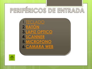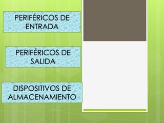 Los periféricos de entrada incluyen el teclado, ratón, lápiz óptico, escáner y micrófono. Los periféricos de salida son el monitor e impresora. Los dispositivos de almacenamiento son la memoria USB, disco duro, cinta magnética y CD-DVD.