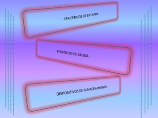 El documento describe diferentes periféricos y dispositivos de entrada/salida de una computadora, incluyendo teclados, ratones, micrófonos, cámaras web, escáners, monitores, impresoras, parlantes, proyectores, memorias USB, discos duros, cintas magnéticas, DVDs/CDs y tarjetas de memoria. Explica brevemente la función de cada uno.