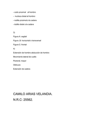 El documento lista los músculos principales involucrados en la biomecánica del cuerpo humano, incluyendo el esternocleidomastoideo, trapecio, deltoides y otros. También describe las articulaciones como la flexión del codo, extensión de la cadera y flexión de las rodillas. Explica la posición anatómica y muestra figuras de cortes sagitales, horizontales y frontales del cuerpo. Finalmente, detalla algunos movimientos como la extensión del hombro, abducción del hombro y extensión de la