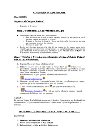 Este documento proporciona instrucciones para capacitarse en el uso de aulas virtuales. Explica cómo ingresar al campus virtual, hacer servicios visibles u ocultos, y manejar documentos dentro del aula virtual, incluyendo la creación de una estructura de directorios y la carga de archivos y carpetas. También cubre cómo añadir enlaces y categorías dentro del servicio de enlaces del aula virtual. La tarea asignada es añadir 3 enlaces de interés al aula virtual y 2 enlaces adicionales dentro de una nueva categor