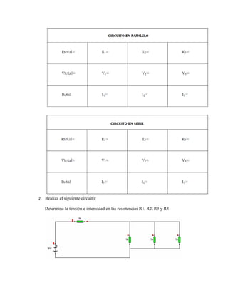 El documento presenta 5 ejercicios sobre circuitos eléctricos. Los estudiantes deben completar cuadros con datos de circuitos, determinar tensiones e intensidades en resistencias, explicar qué sucede al oprimir un pulsador y nombrar el fenómeno, calcular una resistencia total a partir de mediciones, e identificar componentes de un circuito y calcular resistencias en diferentes posiciones de un interruptor.