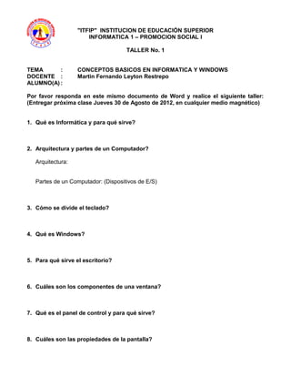 Este documento presenta 15 preguntas sobre conceptos básicos de informática y Windows para un taller de capacitación. Las preguntas cubren temas como la definición de informática, los componentes de hardware de una computadora, la división del teclado, el propósito del escritorio de Windows, los componentes de una ventana, el panel de control, la configuración de la pantalla, la configuración regional, el formateo, herramientas de mantenimiento como el desfragmentador y el limpiador de disco, cómo detectar y desbloquear una computadora bloqueada,