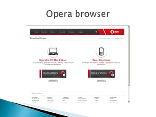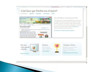 El documento describe varios navegadores web, incluyendo sus características principales como personalización, seguridad, rendimiento y compatibilidad con estándares. También discute motores de búsqueda como Google, Lycos y Metacrawler y cómo funcionan los meta buscadores.