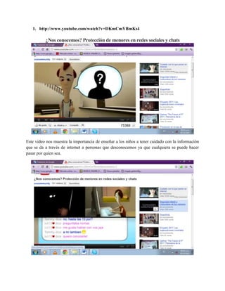 Este documento lista varios recursos educativos en línea como videos, programas, páginas web y motores de búsqueda que cubren temas como la protección de menores en internet, el uso efectivo de motores de búsqueda, apoyo para personas con necesidades educativas especiales, el impacto de las tecnologías de la información en la educación, sitios con juegos y actividades educativas para niños, y un motor de búsqueda de imágenes.