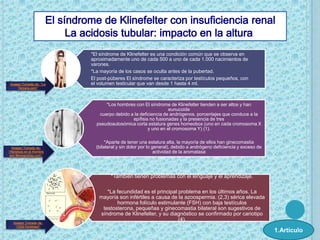 El síndrome de Klinefelter se caracteriza por la presencia de al menos un cromosoma X extra en los varones, lo que usualmente toma la forma de 47,XXY. Esto ocurre debido a una no disyunción meiótica y causa problemas reproductivos como infertilidad, así como desafíos en el aprendizaje y lenguaje. El tratamiento más común es la terapia de reemplazo de testosterona, aunque esto puede aumentar el riesgo de cáncer de próstata.