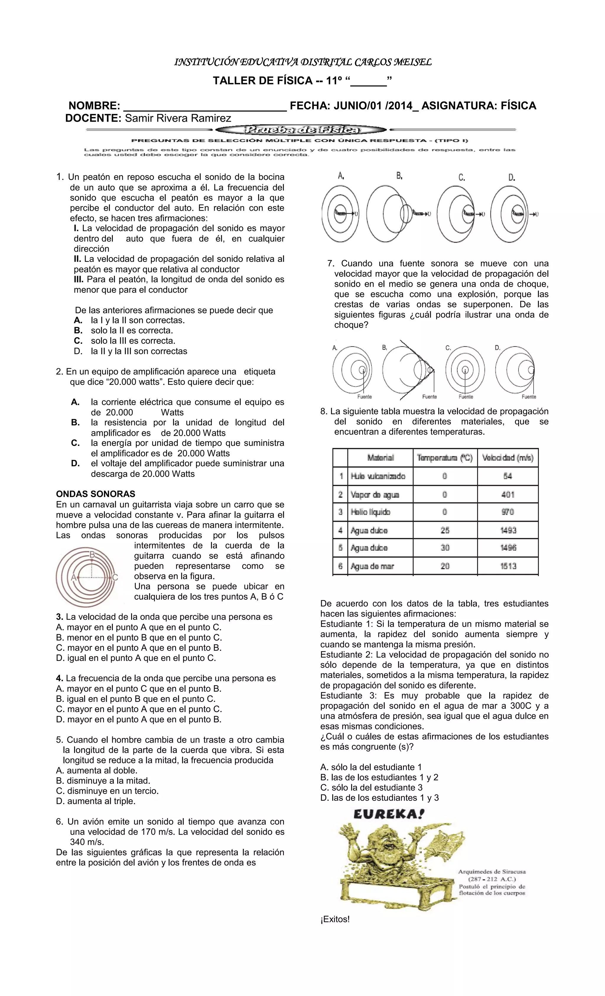 El documento presenta un taller de física con 8 preguntas sobre ondas sonoras. La primera pregunta trata sobre el efecto Doppler y afirma que la velocidad del sonido relativa al peatón es mayor que relativa al conductor. La segunda pregunta se refiere a la potencia de un equipo de amplificación. Las preguntas 3 a 7 se refieren a gráficas y figuras relacionadas con ondas sonoras emitidas por una guitarra y un avión. La última pregunta evalúa afirmaciones sobre cómo la velocidad del sonido depende de la temper