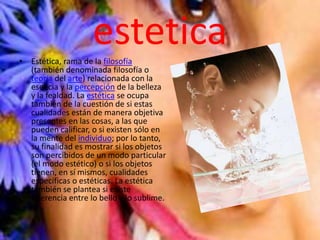 Este documento trata sobre la estética y diferentes aspectos relacionados como la belleza, el arte y la música. Explora las definiciones de estética como una rama de la filosofía relacionada con la percepción de la belleza y si esta es subjetiva u objetiva. También discute la diferencia entre lo bello y lo sublime, así como los efectos de apreciar la belleza. Define el arte como una disciplina que requiere talento y habilidad en diferentes contextos como la literatura, música o artes visuales e involucra tanto a creadores como