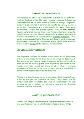 El documento habla sobre los diferentes formatos que se pueden aplicar a un documento, incluyendo formatos de fuente, párrafo, página, sección, bordes, sombreados y distribución de texto. Explica que todas estas opciones de formato se pueden acceder desde el menú formato.