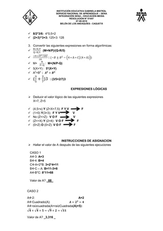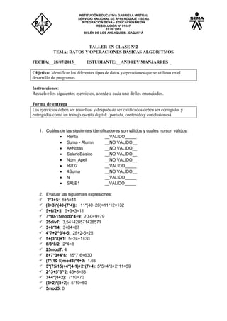 El documento presenta un taller sobre datos y operaciones básicas en algoritmos. Incluye ejercicios para identificar identificadores válidos e invalidos, evaluar expresiones matemáticas y algebraicas, convertir expresiones a forma algorítmica, deducir valores lógicos de expresiones lógicas, y hallar valores de variables después de instrucciones de asignación. Los estudiantes deben resolver los ejercicios y entregarlos como un trabajo escrito digital.