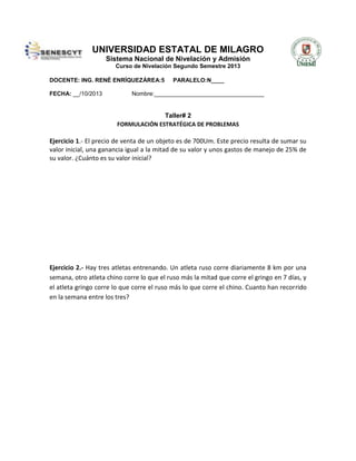Este documento presenta dos ejercicios de formulación estratégica de problemas para un taller de nivelación en la Universidad Estatal de Milagro. El primer ejercicio pide calcular el valor inicial de un objeto si se conoce su precio de venta final y que este precio final es la suma de su valor inicial, la mitad de este valor como ganancia, y unos gastos de manejo del 25% de su valor. El segundo ejercicio pide calcular la distancia total recorrida en una semana por tres atletas (ruso, chino y gringo) entrenando si