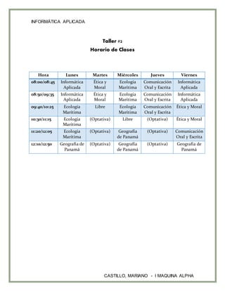 El documento presenta el horario de clases semanal de Mariano Castillo de la maquina Alpha. Tiene clases de Informática Aplicada los lunes, martes, jueves y viernes de 8:00 a 8:45 y de 8:50 a 9:35. Los miércoles tiene Ética y Moral de 8:00 a 8:45 y de 8:50 a 9:35.