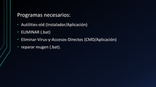El documento proporciona instrucciones para desinfectar una computadora mediante el uso de programas como Autilities-old y archivos .bat. Primero se inicia el equipo en modo seguro y se ejecutan los archivos .bat para eliminar virus y accesos directos no deseados. Luego se instala Autilities-old y se ejecuta un análisis completo del sistema para identificar y reparar cualquier problema, acelerando el rendimiento general del equipo.