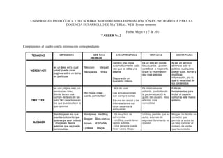El documento presenta una tabla para comparar Wikispace, Twitter y Blogger. Explica que Wikispace permite crear páginas sobre temas particulares donde los usuarios pueden contribuir fácilmente. Twitter limita los mensajes a 140 caracteres para compartir actualizaciones cortas. Blogger ofrece un espacio personal para que autores publiquen sobre sus intereses u otros temas a través de texto, videos e imágenes.