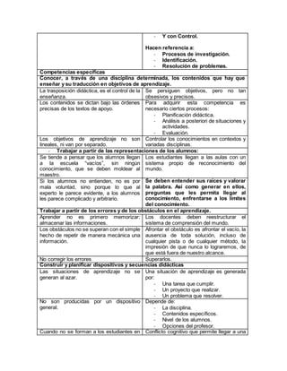 El documento habla sobre las competencias para enseñar descritas por Perrenoud, enfocándose en organizar y animar situaciones de aprendizaje. Propone que los maestros generen situaciones didácticas amplias, abiertas, con sentido y control para que los estudiantes puedan investigar y resolver problemas en lugar de recibir información de forma pasiva. También enfatiza la importancia de trabajar a partir de los conocimientos y errores de los estudiantes para superar obstáculos en el aprendizaje. El maestro debe guiar a los estudiantes en