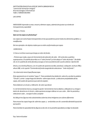 Las capas son como hojas transparentes en Photoshop que permiten agregar y modificar elementos gráficos de manera independiente. El documento explica cómo crear un archivo con fondo de color azul y luego agregar varias capas con figuras como círculos de diferentes colores, y cómo mover y cambiar la opacidad de las capas. El ejercicio muestra el proceso de dibujar un círculo en una nueva capa y rellenarlo de color, y luego agregar más figuras en capas superpuestas con colores diferentes.