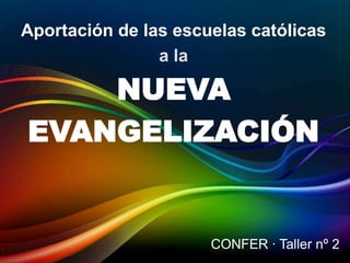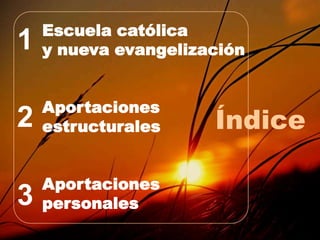 Este documento describe las contribuciones que las escuelas católicas pueden hacer a la nueva evangelización. Primero, proporcionan un ambiente educativo inspirado en los valores del Evangelio que hace visible el carácter cristiano. Segundo, ofrecen enseñanza religiosa escolar cuidada con esmero en contenidos, personas y medios con un enfoque pastoral y vivencial. Tercero, el profesorado lleva el Evangelio a la pedagogía y sirve como guía para los jóvenes con una actitud de misericordia