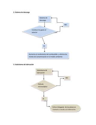 Este documento describe los principales subsistemas de un motor de vehículo y sus funciones. Los subsistemas incluyen la distribución, descarga, lubricación, enfriamiento y admisión. Cada subsistema desempeña un papel crítico para garantizar el funcionamiento eficiente del motor, la durabilidad de las piezas y la reducción de emisiones contaminantes. Un mantenimiento adecuado de cada subsistema es fundamental para evitar fallas y mantener bajos los costos de reparación.