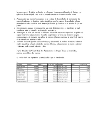 El documento proporciona instrucciones para crear macros en Excel. Explica cómo grabar una macro, ejecutarlas, asignarles teclas de acceso, y eliminarlas. También describe la relación entre macros y Visual Basic, e identifica funciones como Si, Promedio, y Máx/Mín. Finalmente, incluye un ejemplo de macro para calcular bonos del 7% de las ventas totales.