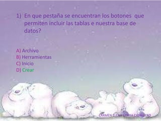 El documento contiene un taller de 10 preguntas sobre la creación y definición de tablas en bases de datos. Las preguntas cubren temas como dónde encontrar los botones para incluir tablas, qué vista es la más adecuada para definir la estructura de una tabla, los campos mínimos requeridos y sus propiedades, las claves principales, cómo rellenar los datos y cerrar una tabla.
