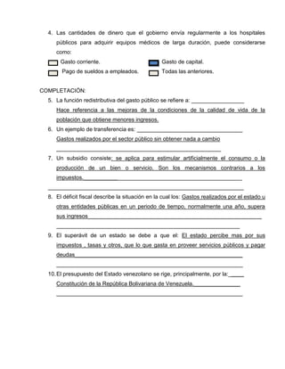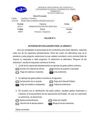 Este documento contiene dos actividades de evaluación para las unidades V y VI de la asignatura de Finanzas e Impuestos. La primera actividad contiene 10 preguntas sobre conceptos relacionados con el gasto público como gastos corrientes, de capital, extraordinarios y transferencias. La segunda actividad contiene 5 preguntas sobre características de las finanzas privadas, la meta de la actividad financiera privada y el propósito de las cooperativas.