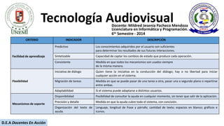 El documento describe criterios e indicadores para evaluar software educativo. Algunos criterios clave son la facilidad de aprendizaje, flexibilidad y mecanismos de soporte. La facilidad de aprendizaje se mide por la predictibilidad, capacidad de síntesis y consistencia. La flexibilidad considera la iniciativa de diálogo, migración de tareas y adaptabilidad. Los mecanismos de soporte incluyen disponibilidad, precisión, organización y lenguaje de la ayuda.