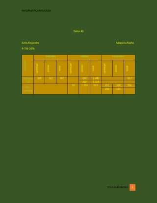 Este documento parece ser una tabla de inventario que lista las entradas, salidas y existencias de tres productos. Incluye la cantidad, precio y total para cada producto en las categorías de compra, desarrollo y existencia.