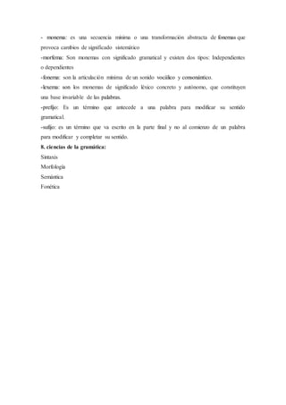 El documento resume los conceptos clave del estructuralismo lingüístico de Ferdinand de Saussure. Explica que Saussure estudió el signo lingüístico y propuso que este consiste en un significante (imagen acústica) y un significado (concepto). También define el lenguaje como un sistema de comunicación y el habla como su uso individual. Finalmente, detalla las características del signo lingüístico y los diferentes componentes de este como monemas, morfemas, fonemas, lexemas, prefijos y sufijos.