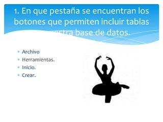 Este documento presenta 10 preguntas de opción múltiple sobre la creación y definición de tablas en bases de datos. Las preguntas cubren temas como la pestaña donde se incluyen tablas, la vista más adecuada para definir la estructura de una tabla, los campos mínimos requeridos y sus propiedades, la clave principal y su obligatoriedad, y los tipos de datos válidos para campos.