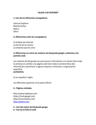 El documento habla sobre el uso de diferentes navegadores de internet como Internet Explorer, Firefox y Opera, y las diferencias entre ellos. También discute la diferencia entre motores de búsqueda como Google y Altavista y páginas web. Incluye ejemplos de páginas visitadas y cómo usar el motor de búsqueda Google y la ficha de una página web.